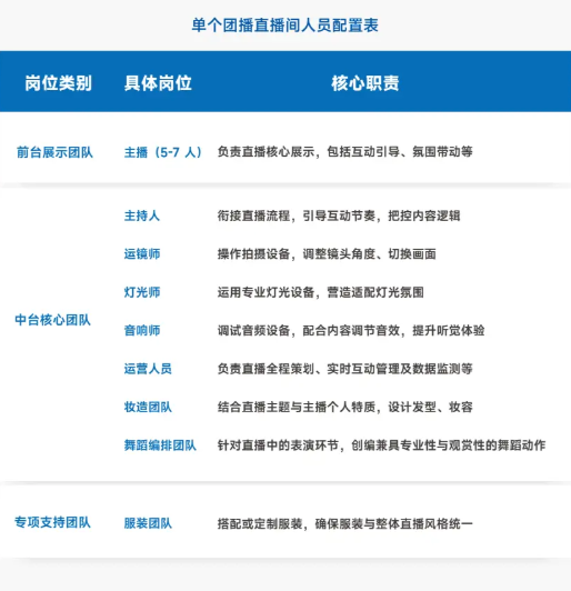 高度细分的产业链更衍生出大量就业机会。以单场团播为例,前台需配置5-7名主播负责核心展示,幕后则需8-11人的中台及支持团队,涵盖主持人、运镜师、灯光师、运营等核心岗位,以及妆造、舞蹈指导、服装设计等专项支持人员,形成“前台展示+幕后支撑”的完整人员架构,为数字经济领域创造了多元化就业岗位。