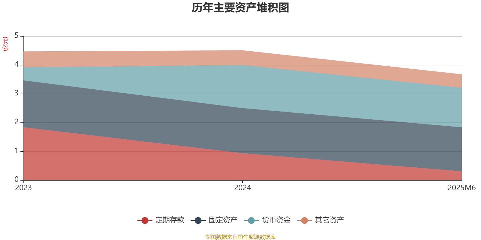 资产重大变化方面,截至2025年6月,公司定期存款较上期末减少67.46%,占公司总资产比重下降12.41个百分点;固定资产较上期末减少2.28%,占公司总资产比重上升6.94个百分点;货币资金较上期末减少8.47%,占公司总资产比重上升4.12个百分点;预付账款较上期末减少47.25%,占公司总资产比重下降0.89个百分点。