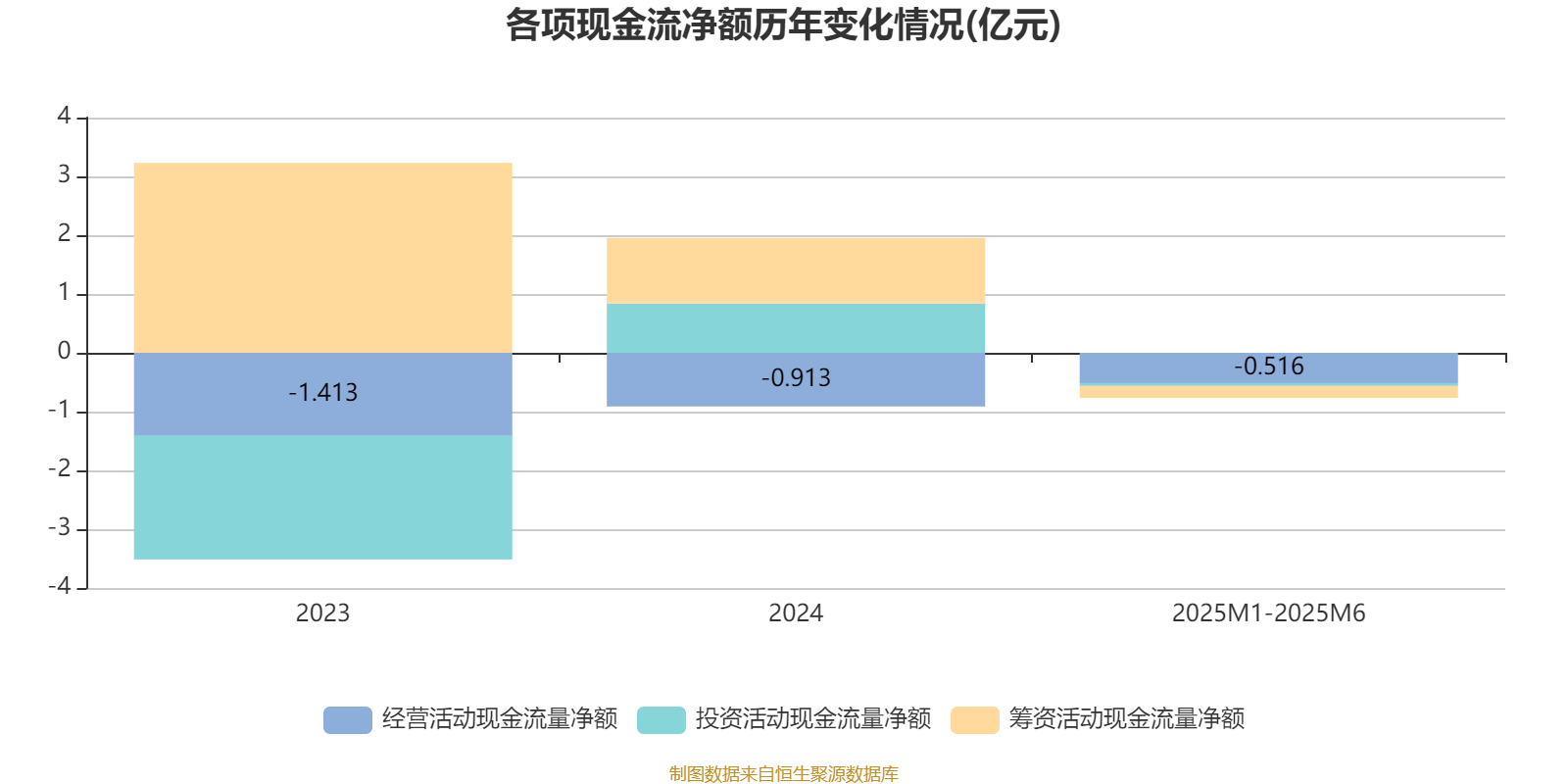 2025年1月至6月,公司经营活动现金流净额为-5162.8万元,同比增加1514万元;筹资活动现金流净额-2021.2万元,同比减少147.1万元;投资活动现金流净额-484.7万元,上年同期为4488.2万元。