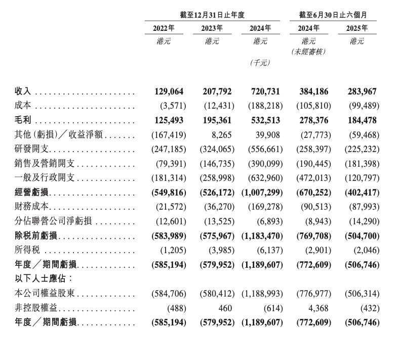 财报显示,2022年、2023年、2024年该公司分别实现收入1.29亿港元、2.08亿港元、7.21亿港元,分别录得亏损5.85亿港元、5.80亿港元、11.90亿港元。从2025年中报来看,今年前6个月该公司实现收入2.84亿港元,产生亏损5.07亿港元。