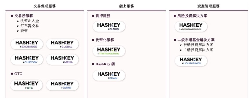 上市主体HashKey Holdings Limited是Hashkey Group(Hashkey集团)的持股平台(以下统称HashKey)。HashKey是一家综合性数字资产金融服务集团,旗下板块包括香港虚拟资产交易所HashKey Exchange,全球虚拟资产交易所 HashKey Global,资产管理机构 HashKey Capital,场外交易服务 HashKey OTC, Web3基础设施业务HashKey Cloud,代币化服务 HashKey Tokenisation等,并已推出HashKey链。