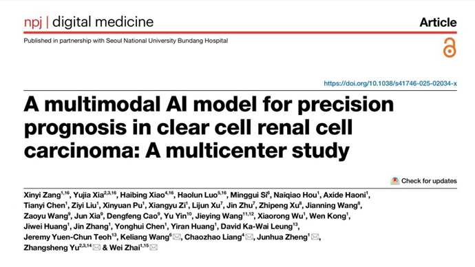 近日,上海交通大学医学院附属仁济医院泌尿科郑军华教授、翟炜研究员团队联合多中心力量,在肾癌精准预后领域取得重大突破。团队研发的多模态预测复发评分(MPRS)模型,成功发表于Nature旗下全球数字医学顶尖期刊npjDigitalMedicine,为透明细胞肾细胞癌(ccRCC)患者的复发风险评估与个体化治疗提供了关键支撑。