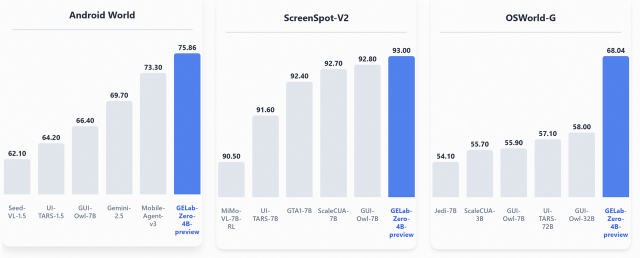 GUI(Graphical User Interface)意为图形用户界面。阶跃星辰在ScreenSpot、OSWorld、MMBench、Android World多个开源基准测试上对GELab-Zero-4B-preview 模型进行了全面评估,涵盖了GUI理解、定位、交互等多个维度。测试结果显示,GELab-Zero-4B-preview在多项权威开源基准测试中超越其他主流模型,拿下同尺寸SOTA。同时,GELab-Zero-4B-preview 的表现还超越了参数量更大的 GUI-Owl-32B 等模型,性能更优也更易部署。