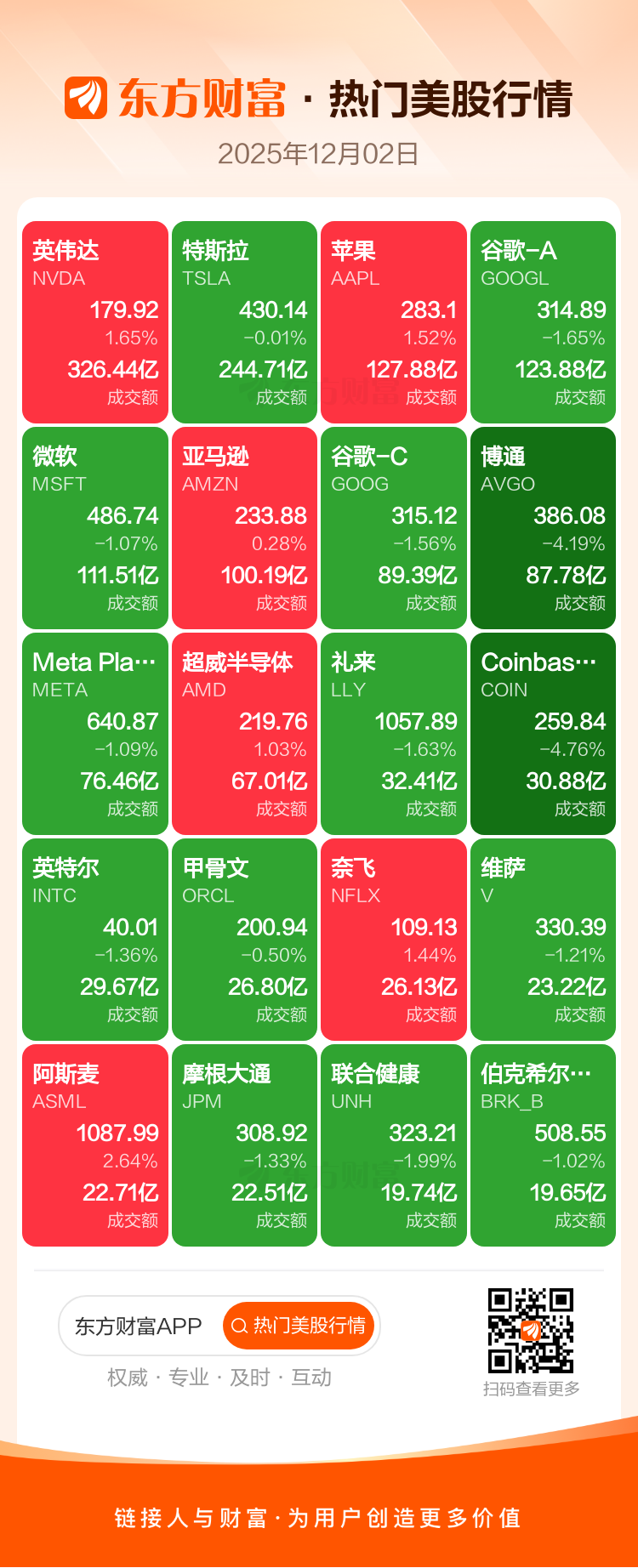 英伟达涨1.65%,特斯拉跌0.01%,苹果涨1.52%,谷歌-A跌1.65%,微软跌1.07%,亚马逊涨0.28%,谷歌-C跌1.56%,博通跌4.19%,Meta Platforms Inc-A跌1.09%,超威半导体涨1.03%。