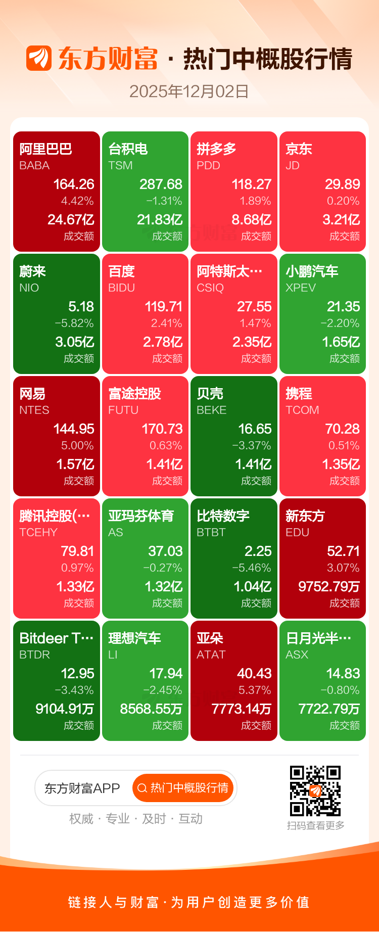 阿里巴巴涨4.42%,台积电跌1.31%,拼多多涨1.89%,京东涨0.20%,蔚来跌5.82%,百度涨2.41%,阿特斯太阳能涨1.47%,小鹏汽车跌2.20%,网易涨5.00%,富途控股涨0.63%。