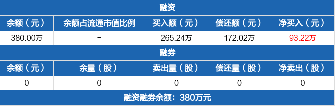 融资方面,当日融资买入265.24万元,融资偿还172.02万元,融资净买入93.22万元,连续3日净买入累计114.47万元。融券方面,融券卖出0份,融券偿还0份,融券余量0份,融券余额0元。融资融券余额合计380万元。