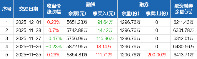 融资方面,当日融资买入109.7万元,融资偿还201.35万元,融资净偿还91.64万元,连续3日净偿还累计221.72万元。融券方面,融券卖出0份,融券偿还0份,融券余量1296.76万份,融券余额560.2万元。融资融券余额合计6211.43万元。