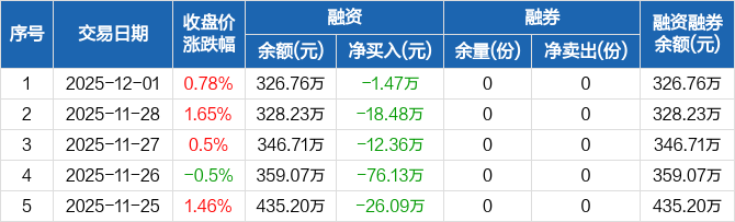 融资方面,当日融资买入42.25万元,融资偿还43.73万元,融资净偿还1.47万元,连续5日净偿还累计134.53万元。融券方面,融券卖出0份,融券偿还0份,融券余量0份,融券余额0元。融资融券余额合计326.76万元。