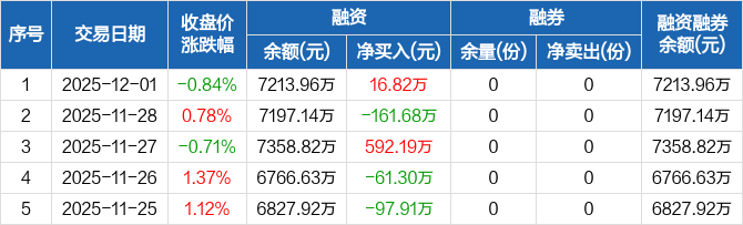 融资方面,当日融资买入591.14万元,融资偿还574.31万元,融资净买入16.82万元。融券方面,融券卖出0份,融券偿还0份,融券余量0份,融券余额0元。融资融券余额合计7213.96万元。