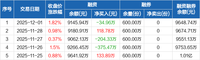 融资方面,当日融资买入708.83万元,融资偿还743.8万元,融资净偿还34.96万元。融券方面,融券卖出0份,融券偿还0份,融券余量600万份,融券余额502.8万元。融资融券余额合计9648.74万元。