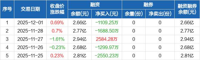 融资方面,当日融资买入2028.94万元,融资偿还3138.19万元,融资净偿还1109.25万元。融券方面,融券卖出0份,融券偿还0份,融券余量0份,融券余额0元。融资融券余额合计2.66亿元。