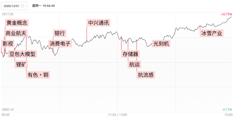 财联社12月2日电,上个交易日市场震荡拉升,沪指重返3900点上方,深成指、创业板指均涨超1%。全市场近3400只个股上涨。沪深两市成交额1.87万亿,较上周五放量2881亿。1)豆包手机助手发布技术预览版。对此,中兴通讯表示目前搭载该技术预览版的工程样机努比亚M153已少量发售。在该消息刺激下,AI手机为首的消费电子、端侧硬件股全天大放异彩,中兴通讯、广和通、昀冢科技、博通集成等二十余股涨停或涨超10%。2)近期戴尔、惠普等消费电子大厂相继宣布,由于存储芯片面临短缺,可能考虑上调部分设备定价。存储芯片概念午后卷土冲来,进而带动晶圆制造、设备、功率半导体等方向热度升温,北京君正封20厘米涨停,华润微、华海诚科、兆易创新等纷纷位居涨幅前列。3)受供应吃紧和美联储降息预期双重提振,现货白银、沪银主力、LME期铜、沪铜主力相继创出历史新高,其中现货白银价格年内涨超90%。有色板块全天表现强势,罗平锌电、江西铜业、兴业银锡、白银有色、湖南白银盘中均触及涨停。4)据报道,国家航天局已于近期设立商业航天司,这标志着我国商业航天产业迎来专职监管机构。上周表现火热的商业航天概念维持强势,航天发展、顺灏股份、银河电子、通宇通讯均实现连板晋级,航宇微、乾照光电、航天环宇均涨超10%。