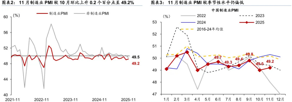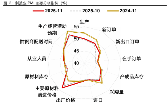11月PMI回升幅度处于季节性中性,不过10月PMI已是同期低点,温和回升反映经济动能的改善相对有限。拆分结构看,11月新订单、生产分别拉动PMI环比回升约0.1pct。工作日天数增加,生产节奏加快,生产与下游订单均有改善,但淡季效应更占主导,PMI回升幅度较为有限。但结构上,原材料购进价格、出厂价格加速改善,建筑业PMI业务活动预期连续两个月改善,积极信号增多,“反内卷”与前期宽信用政策对预期的影响或在持续。