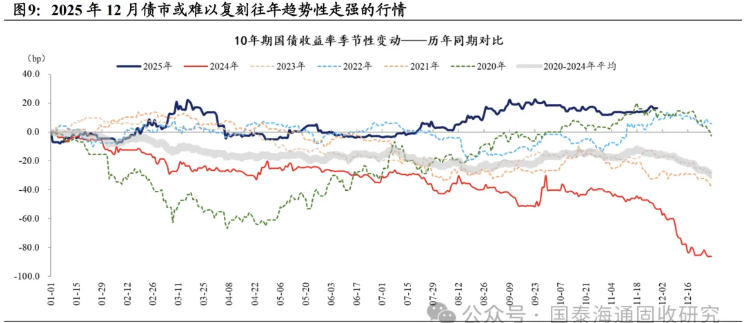 对于12月整体的债市行情时,我们认为难以重现往年趋势性走强的行情,即使超跌反弹也可能弱于10月。但由于宏观环境对年内债市定价有支撑,仍然可以参与博弈部分券种的超跌反弹。其中,最重要的是把握以下两方面逻辑:其一,最具确定性同时也最为核心是对宏观环境的判断,由于基本面读数偏弱+资金宽松+股市震荡+增量稳增长政策出台的概率不高,债市中枢定价依然有一定支撑。其二,从机构行为来看,相比往年,2025年末配置机构“抢跑”的力量可能明显偏弱,“落袋为安”的意愿可能大于“抢跑”。