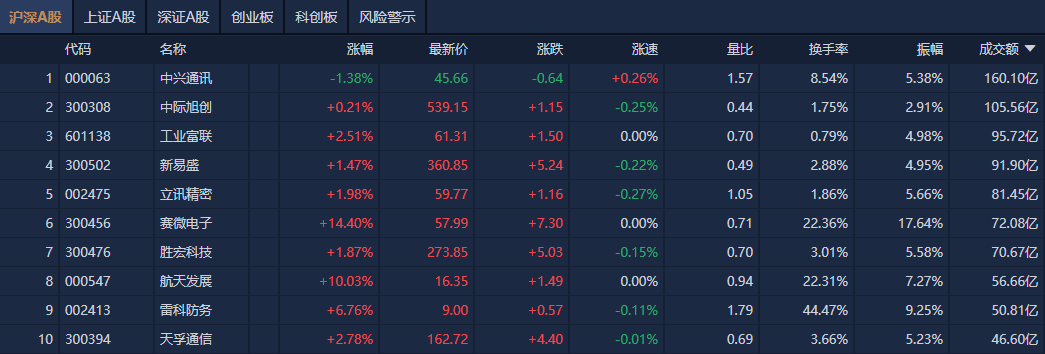 个股方面,中际旭创成交额超160亿元居首,中际旭创、工业富联、新易盛成交额靠前。