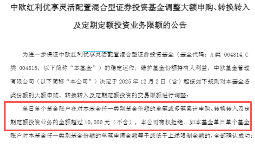 12月2日,中欧基金发布公告称,为保证产品稳定运作,维护基金份额持有人利益,自2025年12月2日起,中欧红利优享、中欧融恒平衡、中欧价值回报、中欧价值领航4只产品,全渠道单日限额进一步降至1万元,蓝小康是这4只基金的基金经理。