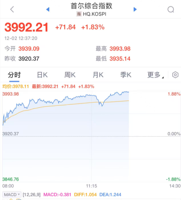 韩国综合股价指数上涨近2%。