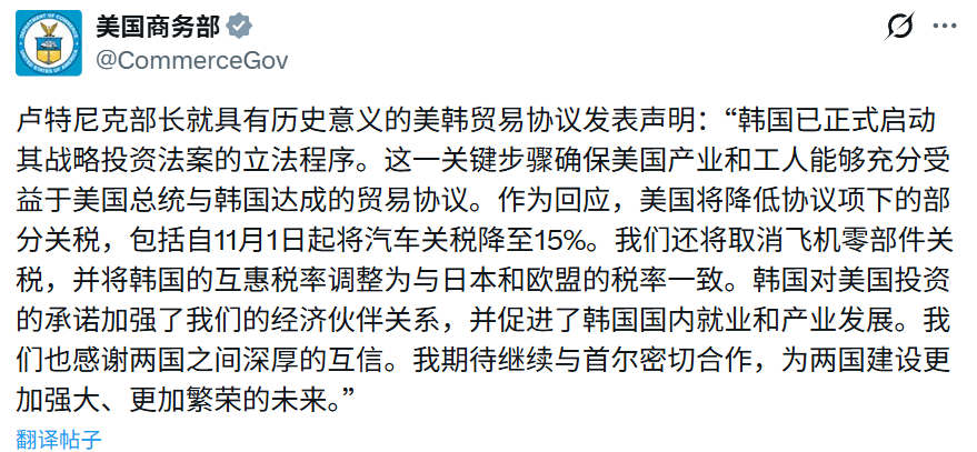 卢特尼克称,由于韩国已在国会提交相关立法,以落实其在美国的战略投资承诺,美国将把包括汽车在内的自韩国进口商品的一般关税税率下调至15%,并自11月1日起追溯生效。