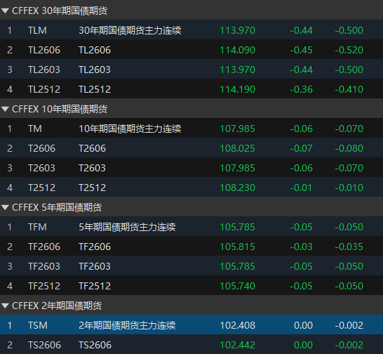 上证报中国证券网讯 12月2日,国债期货早盘收盘多数下跌,30年期主力合约跌0.44%,10年期主力合约跌0.06%,5年期主力合约跌0.05%,2年期主力合约基本持平。