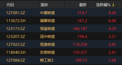 上证报中国证券网讯 12月2日,中证转债指数午盘下跌0.48%,报479.78点。中旗转债、福蓉转债、恒锋转债、冠中转债涨幅居前,分别涨8.26%、6.96%、4.29%、3.21%。大中转债、国城转债、集智转债跌幅居前,分别跌5.58%、3.64%、3.55%。