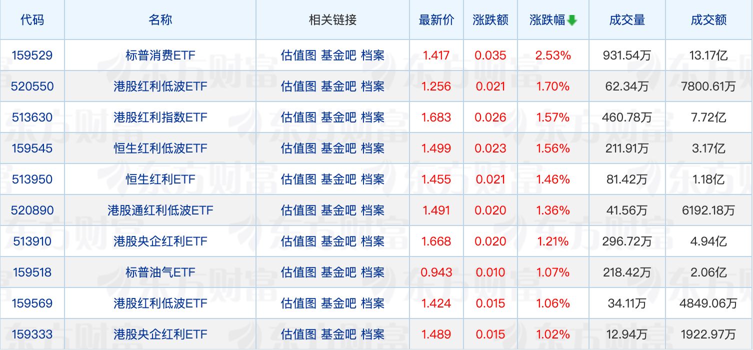 具体来看,标普消费ETF领涨2.53%,港股红利相关ETF集体走强。