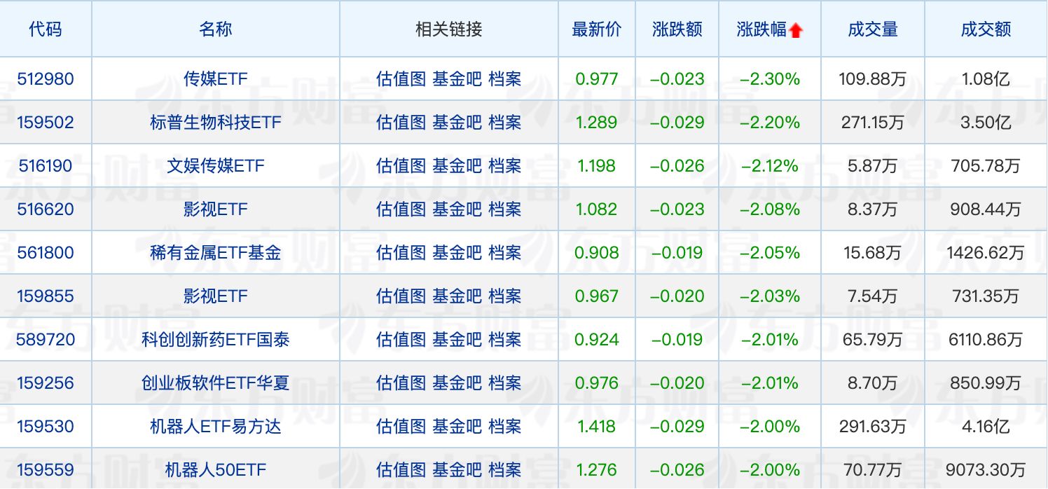 下跌方面,传媒ETF、影视ETF回调居前,最大跌幅为2.30%。