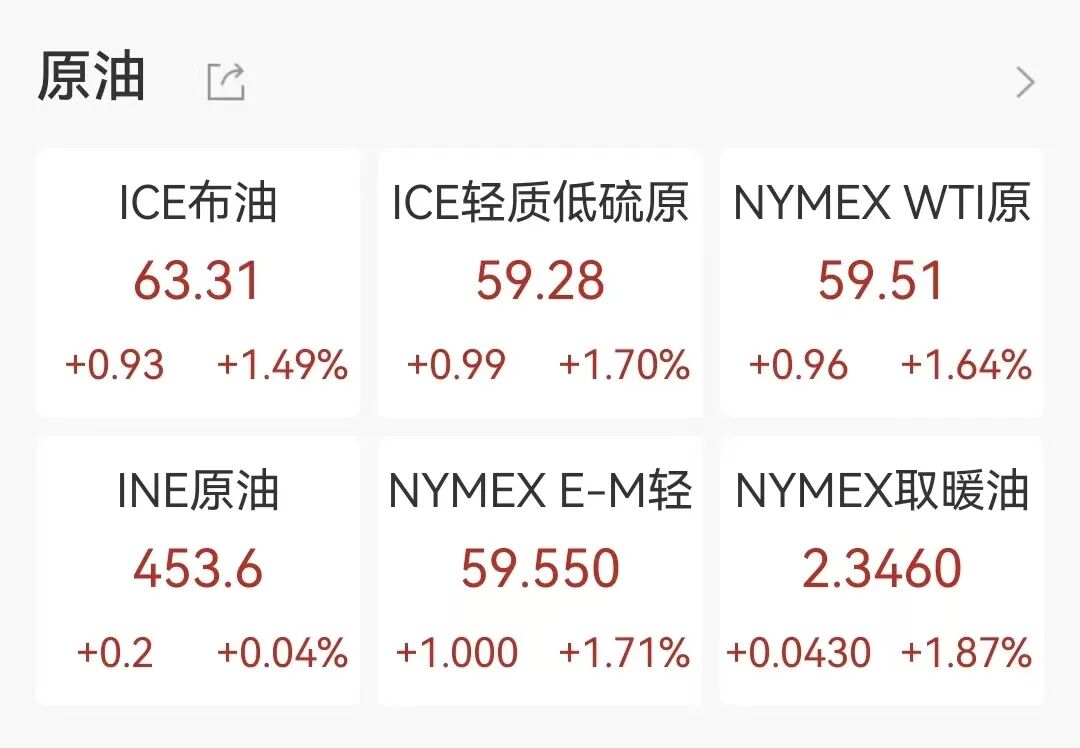 美油主力合约收涨1.64%,报59.51美元/桶;布伦特原油主力合约涨1.49%,报63.31美元/桶。上期所原油期货主力合约夜盘收涨0.04%,报453.60元人民币/桶。据央视财经,黑海关键码头遇袭引发供应担忧,同时OPEC+维持2026年第一季度暂停增产的计划,多重地缘政治风险与供给侧因素推动国际油价上涨。