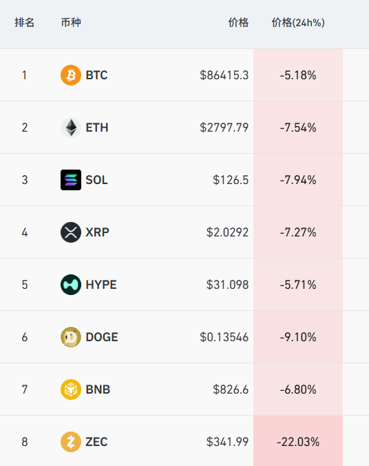 加密货币方面,截至发稿比特币跌超5%,报86415.3美元,深夜盘中一度跌破8.4万美元关口,年内共计跌7.49%;以太坊跌超7%,报2797.79美元。据CoinGlass数据显示,近24小时加密货币全球爆仓人数超27万,爆仓金额9.93亿美元。