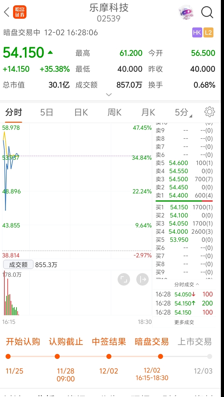 港股新股乐摩科技暗盘一度涨50%,现回落涨逾30%。将于12月3日(星期三)在香港挂牌。
