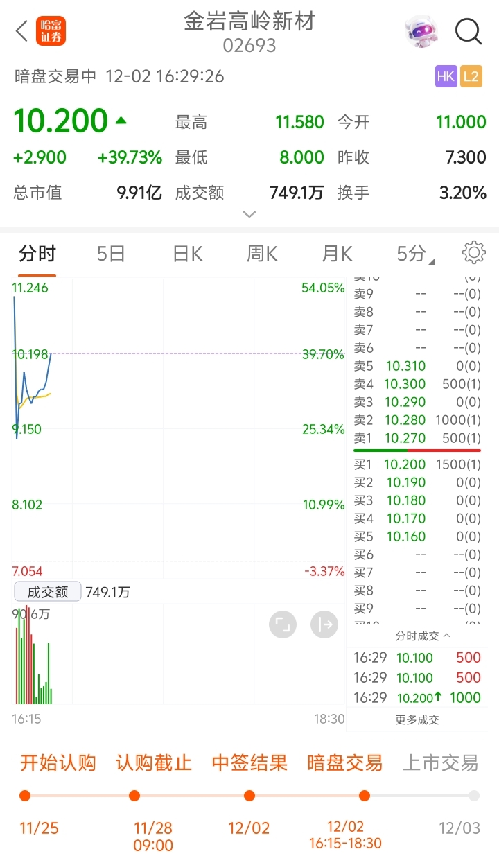 12月2日,金岩高岭新材暗盘涨近40%,总市值突破9亿港元。将于12月3日(周三)在香港挂牌。