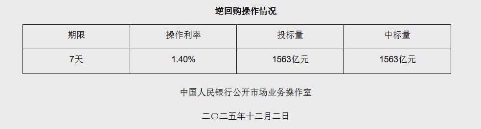 中新网12月2日电据央行网站消息,2025年12月2日中国人民银行以固定利率、数量招标方式开展了1563亿元7天期逆回购操作。具体情况如下: