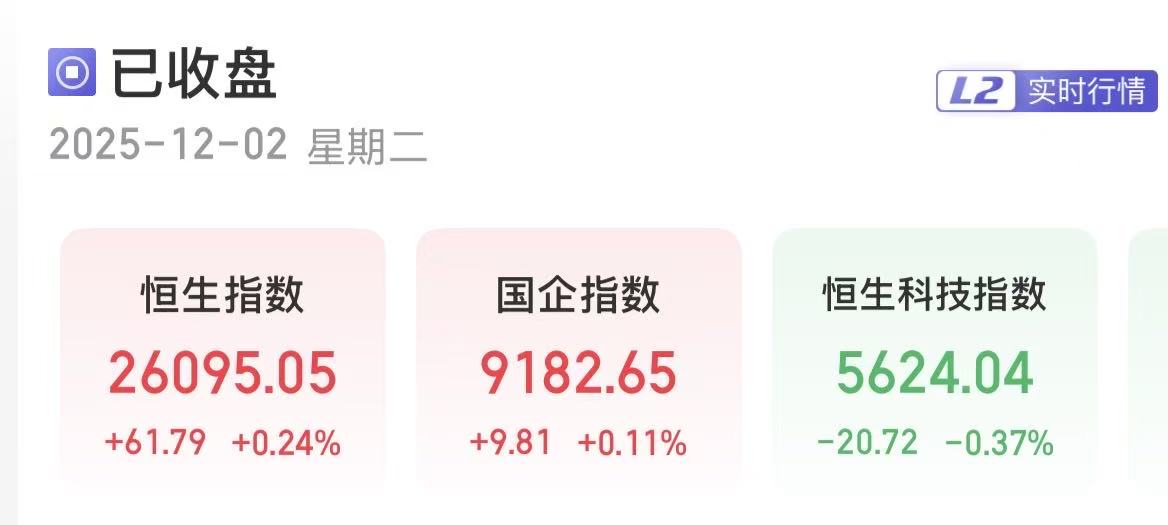 上证报中国证券网讯(刘禹希记者严晓菲)12月2日,港股三大指数涨跌互现。截至收盘,恒生指数涨0.24%,报26095.05点;恒生国企指数涨0.11%,报9182.65点;恒生科技指数跌0.37%,报5624.04点。