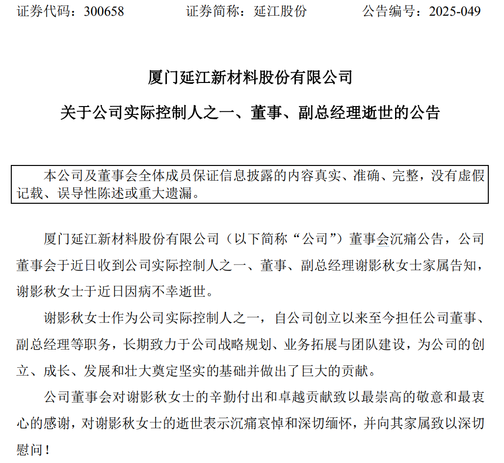 延江股份实控人之一、副总经理谢影秋去世,享年55岁