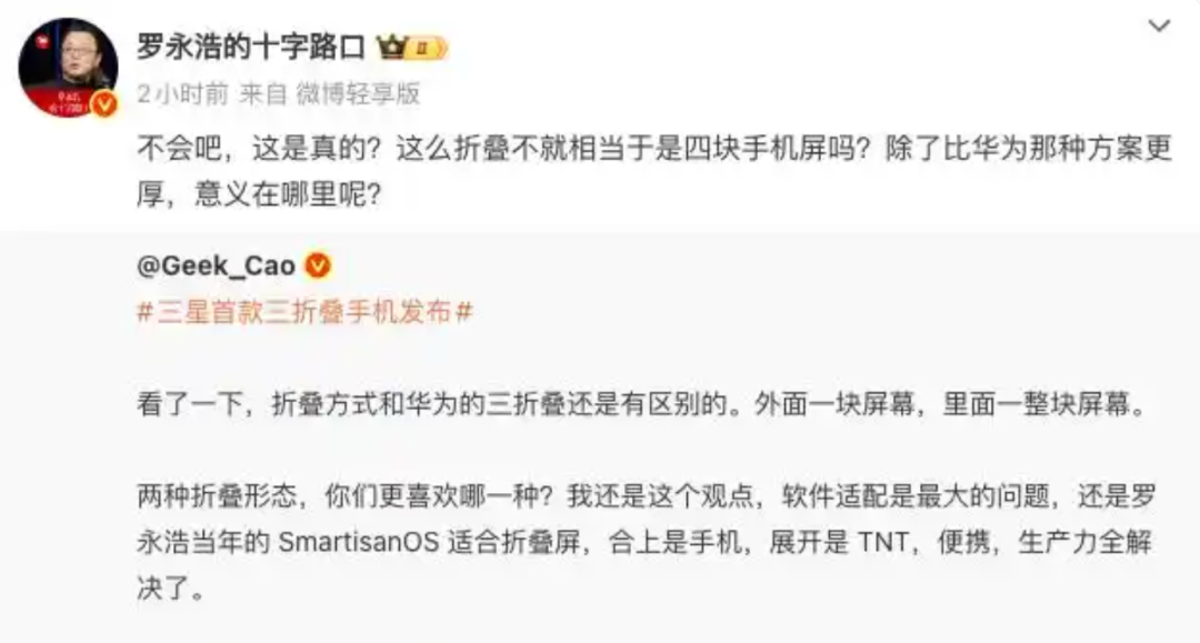 对此,罗永浩点评称,不会吧,这是真的?这么折叠不就相当于是四块手机屏吗?除了比华为那种方案更厚,意义在哪里呢?