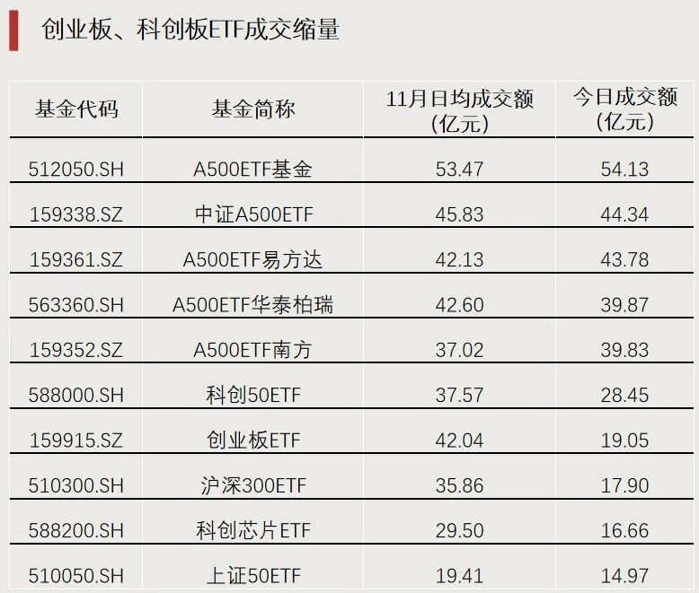 经历了11月最后一个交易周的缩量反弹行情后,12月2日,A股市场出现回调,创业板、科创板相关ETF成交额缩量,不及11月日均成交水平。