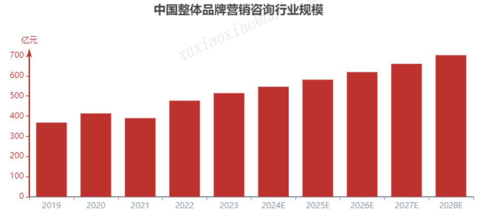 行业研究机构头豹研究院发布的《2024年头豹行业词条报告》显示,2019年~2023年,品牌营销咨询整体行业市场规模由368亿元增长至513.9亿元,期间年复合增长率8.7%。预计2024年~2028年,品牌营销咨询整体行业市场规模由545.8亿元增长至702.1亿元,期间年复合增长率6.4%。