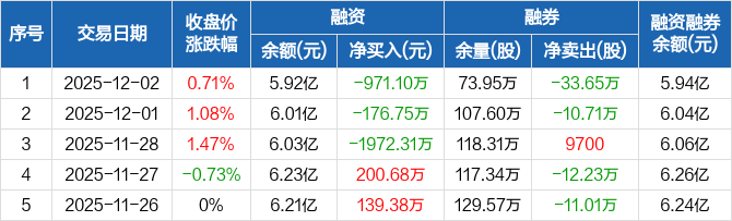 融资方面,当日融资买入2820.85万元,融资偿还3791.95万元,融资净偿还971.1万元,连续3日净偿还累计3120.15万元。融券方面,融券卖出22.73万股,融券偿还56.38万股,融券余量73.95万股,融券余额208.54万元。融资融券余额合计5.94亿元。