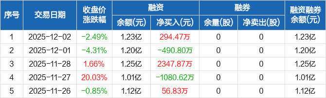 明冠新材融资融券信息显示,2025年12月2日融资净买入294.47万元;融资余额1.23亿元,较前一日增加2.46%。