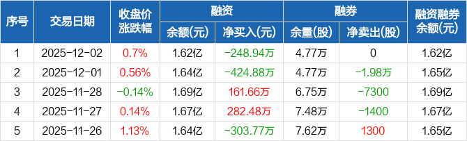航民股份融资融券信息显示,2025年12月2日融资净偿还248.94万元;融资余额1.62亿元,创近一年新低,较前一日下降1.52%。