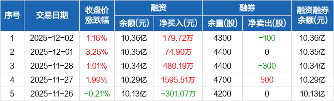 融资方面,当日融资买入5847.83万元,融资偿还5668.12万元,融资净买入179.72万元,连续4日净买入累计2330.31万元。融券方面,融券卖出0股,融券偿还100股,融券余量4300股,融券余额6.76万元。融资融券余额合计10.36亿元。