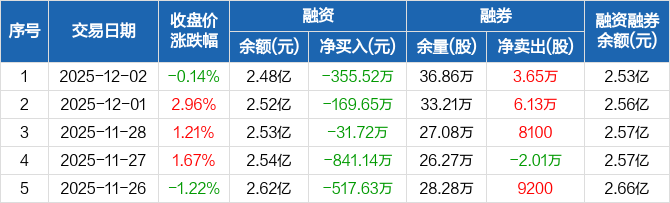 融资方面,当日融资买入1527.34万元,融资偿还1882.86万元,融资净偿还355.52万元,连续6日净偿还累计2699.89万元。融券方面,融券卖出7.72万股,融券偿还4.07万股,融券余量36.86万股,融券余额538.1万元。融资融券余额合计2.53亿元。