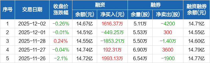 融资方面,当日融资买入7334.31万元,融资偿还5717.94万元,融资净买入1616.37万元。融券方面,融券卖出1000股,融券偿还5200股,融券余量5.11万股,融券余额408.8万元。融资融券余额合计14.71亿元。