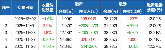 融资方面,当日融资买入2964.44万元,融资偿还2758.48万元,融资净买入205.96万元。融券方面,融券卖出1.79万股,融券偿还5600股,融券余量38.72万股,融券余额310.53万元。融资融券余额合计12.02亿元。