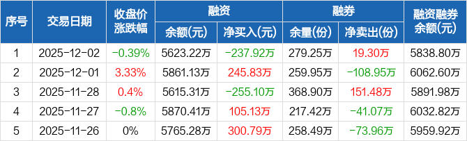 旅游ETF:融资净偿还237.92万元,融资余额5623.22万元(12-02)