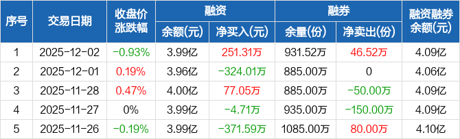 融资方面,当日融资买入2437.17万元,融资偿还2185.86万元,融资净买入251.31万元。融券方面,融券卖出46.52万份,融券偿还0份,融券余量931.52万份,融券余额990.21万元。融资融券余额合计4.09亿元。