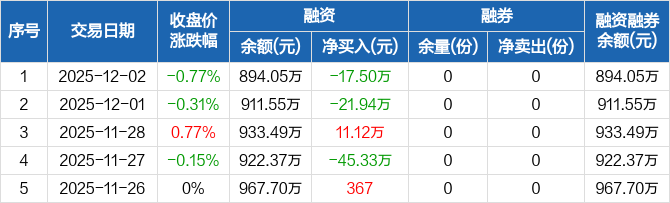 融资方面,当日融资买入77.89万元,融资偿还95.4万元,融资净偿还17.5万元。融券方面,融券卖出0份,融券偿还0份,融券余量0份,融券余额0元。融资融券余额合计894.05万元。