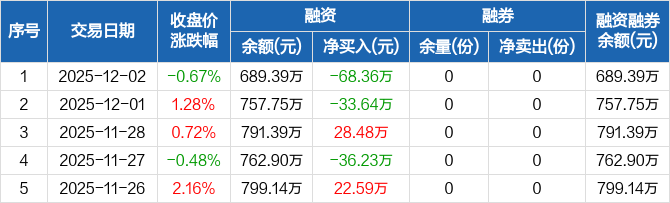 融资方面,当日融资买入121.36万元,融资偿还189.71万元,融资净偿还68.36万元。融券方面,融券卖出0份,融券偿还0份,融券余量0份,融券余额0元。融资融券余额合计689.39万元。