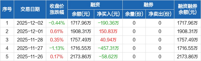 融资方面,当日融资买入387.44万元,融资偿还577.8万元,融资净偿还190.36万元。融券方面,融券卖出0份,融券偿还0份,融券余量0份,融券余额0元。融资融券余额合计1717.96万元。