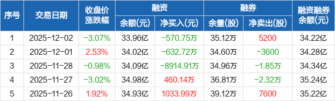 融资方面,当日融资买入2.22亿元,融资偿还2.28亿元,融资净偿还570.75万元,连续3日净偿还累计1.01亿元。融券方面,融券卖出2.68万股,融券偿还2.16万股,融券余量35.12万股,融券余额2506.23万元。融资融券余额合计34.22亿元。