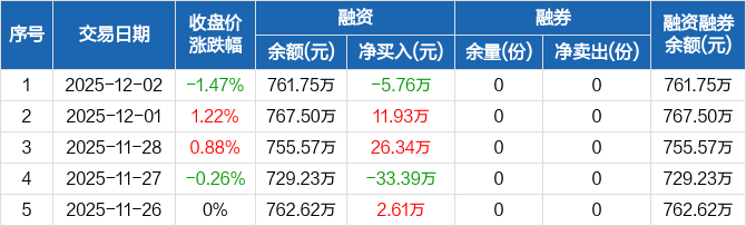 融资方面,当日融资买入26.69万元,融资偿还32.45万元,融资净偿还5.76万元。融券方面,融券卖出0份,融券偿还0份,融券余量0份,融券余额0元。融资融券余额合计761.75万元。